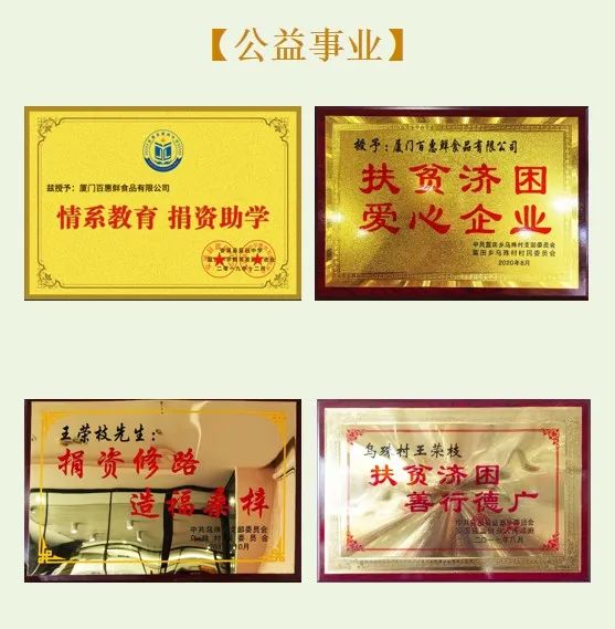 近年來,以王榮枝董事長為主要領(lǐng)導(dǎo)的公司管理團隊積極履行社會責(zé)任,為家鄉(xiāng)在教育事業(yè)、扶貧事業(yè)和基礎(chǔ)建設(shè)上出謀劃策,捐資助力,先后獲得了區(qū)村等相關(guān)部門頒發(fā)的“情系教育 捐資助學(xué)”、“扶貧濟困 愛心企業(yè)”、“捐資修路 造福桑梓”、“扶貧濟困善行德廣”等榮譽。